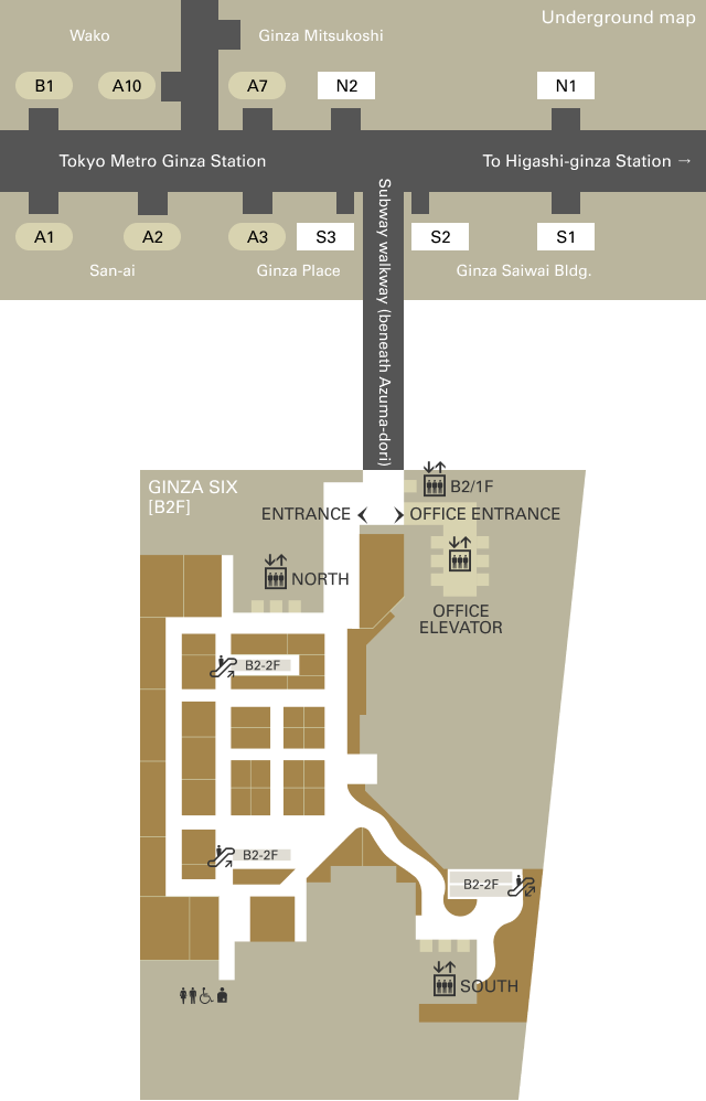 A direct underground walkway connects Tokyo Metro Ginza Station, Higashi-ginza Station, and Toei Higashi-ginza Station to the second GINZA SIX belowground floor.