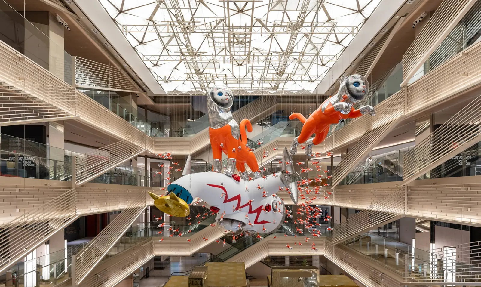 GINZA SIX中央に位置する吹き抜け空間に、日本を代表する現代美術作家・ヤノベケンジによる旅をしながら福を運ぶ猫「SHIP’S CAT」のシリーズともなる新作アート「BIG CAT BANG」が登場します。