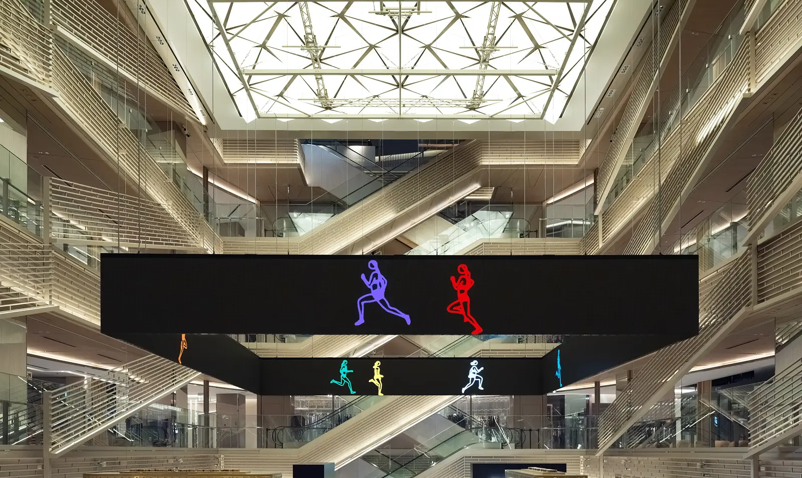 本作は、イギリスの女性スプリンターをモチーフにしたLED映像作品で、7名のランナーがそれぞれ異なる色とスピードで、宙に浮かぶ四角形のスクリーン上を果てしなく走り続ける様子が表現されています。スクリーンの内側と外側の両面に映像が展開されており、2Fから5Fまでの4フロアから、多角的にその動きを鑑賞することができます。「走る」という人間の本能に深く根差した動きが空間全体に広がり、圧倒的な躍動感と没入感をもたらします。ジュリアン・オピー / Julian Opie