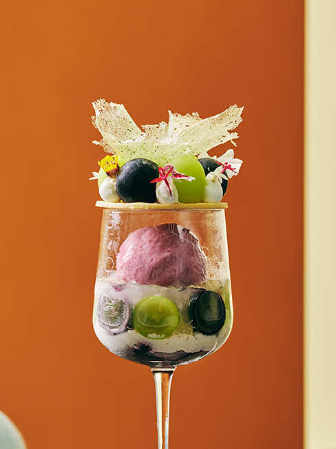秋のメニュー「マルニ パフェ 葡萄」では、シャインマスカットや巨峰に、スダチやハーブ、ナッツを重ね、ブドウの魅力を引き立てる香りのレイヤーを表現。花束のように仕立てられたミント香る飴細工をトップに添えた、視覚的にもマルニらしい華やかさを演出しています。さらに、ブドウの奥から、まさかのモンブランクリームや栗はちみつブランマンジェが現れ、もう一つの旬の味覚の栗も堪能できます。