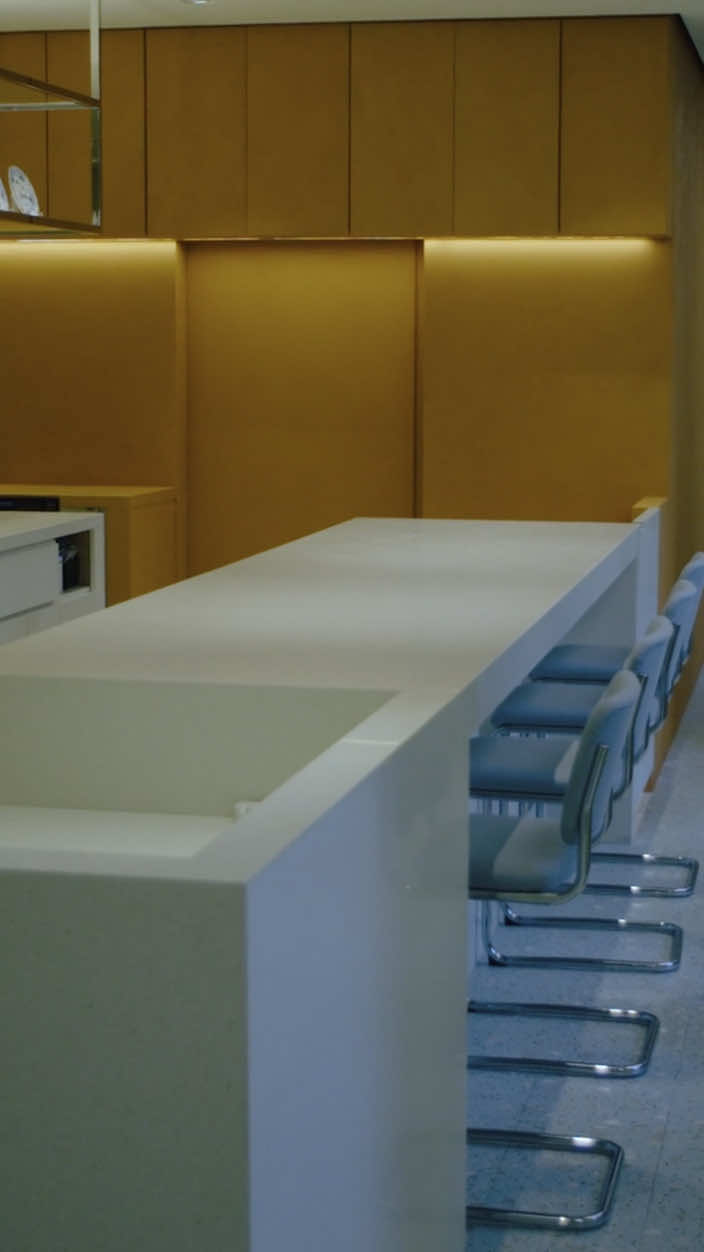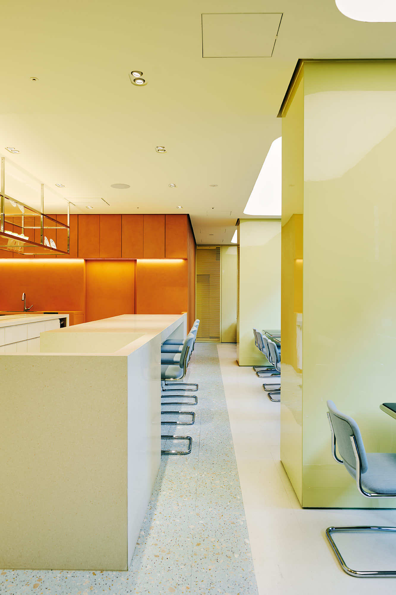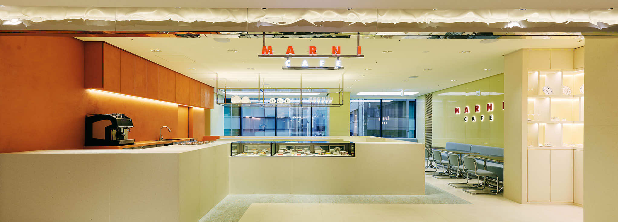 マルニの感性は、インテリアにも反映されています。エントランスを縁取る波打つシルバーパネルのファサード、空間の中心に配したテラゾー製のアイランドカウンター、キッチンの鮮やかなテラコッタカラーの漆喰のマットな壁と、光沢のあるライムイエローの壁。鮮やかな色と柔らかなパステルトーンのカラーブロッキングが特徴的です。また、客席の什器にも注目。黒い大理石とポリッシュ仕上げのスチールのテーブル。脚元はマルニストアの什器にも共通する愛らしいペタルモチーフ。アクアマリンの生地で彩ったマルセル・ブロイヤーの名作チェスカチェアとともに、柔らかさとシャープさとのコントラストでモダンなインテリアを完成させます。色彩と素材を巧みに操るマルニのコレクションにも通じる空間です。