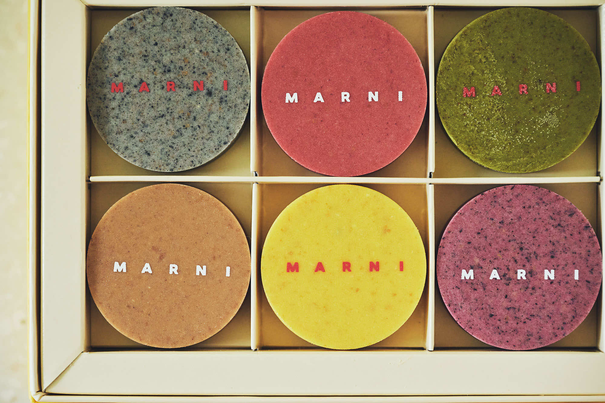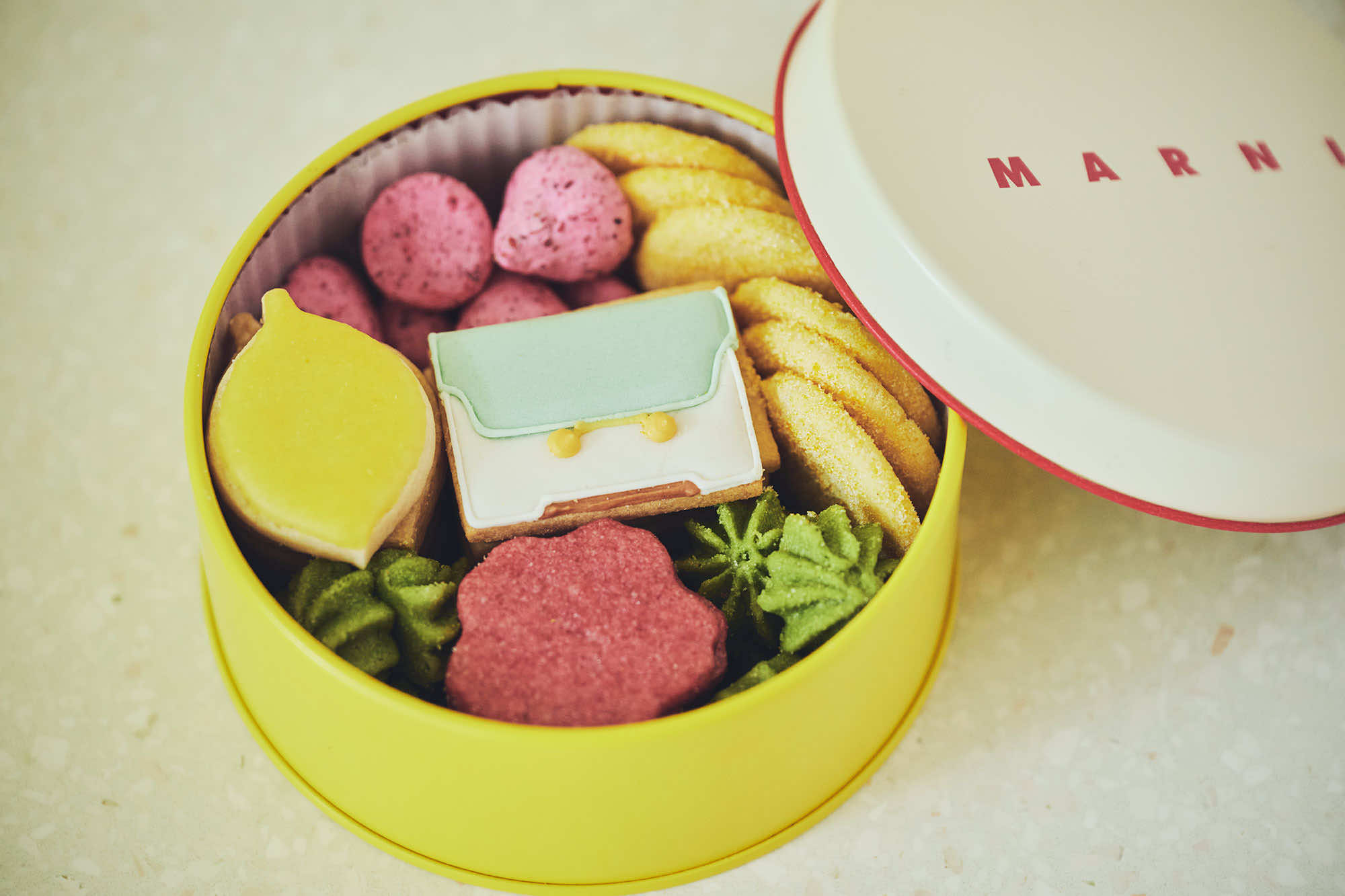 イエロー、レッド、グリーンといったマルニのカラーコードをベースにした、カラフルな塩チョコレートとバターサンドのスペシャルボックスも販売。10月より新登場したクッキー缶には、アイコンバッグの「トランカルー」のアイシングクッキー、フラワーモチーフのフランボワーズのサブレ、クランベリーのメレンゲ、レモンや抹茶など異なる食感や風味のクッキーが6種詰め合わせられています。味わいとデザインの両面からマルニらしさを凝縮したスイーツは、センスを感じさせる手土産としても最適。箱を開けた瞬間からワクワクと心が踊り出しそうです。