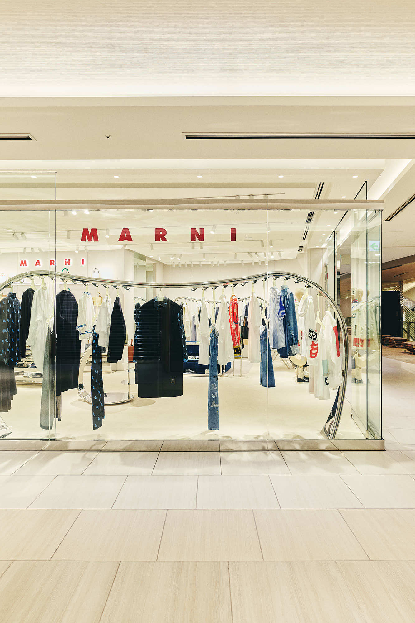 マルニ カフェのオープンに先立ち、6月にリニューアルしたマルニ GINZA SIX。ガラス張りのファサード、柔らかなグレーを基調にした店内には、マルニ ブティックに共通するシンボルともいえる、彫刻的な波状のステンレススチールレールのラックを軸に、メタリックな輝きがアクセントとなった什器や、曲線的なメタルフレームのショーケースなど、1960年代風のデザイン美学を再解釈した有機的かつフューチャリスティックなディテールが散りばめられています。そこに、プルシアンブルーのベルベットソファがアクセントを添えます。シンプルながら、しっかり主張するマルニらしいシルエットと色彩、質感の対比が、エレガントで現代的なムードを演出するインテリアです。