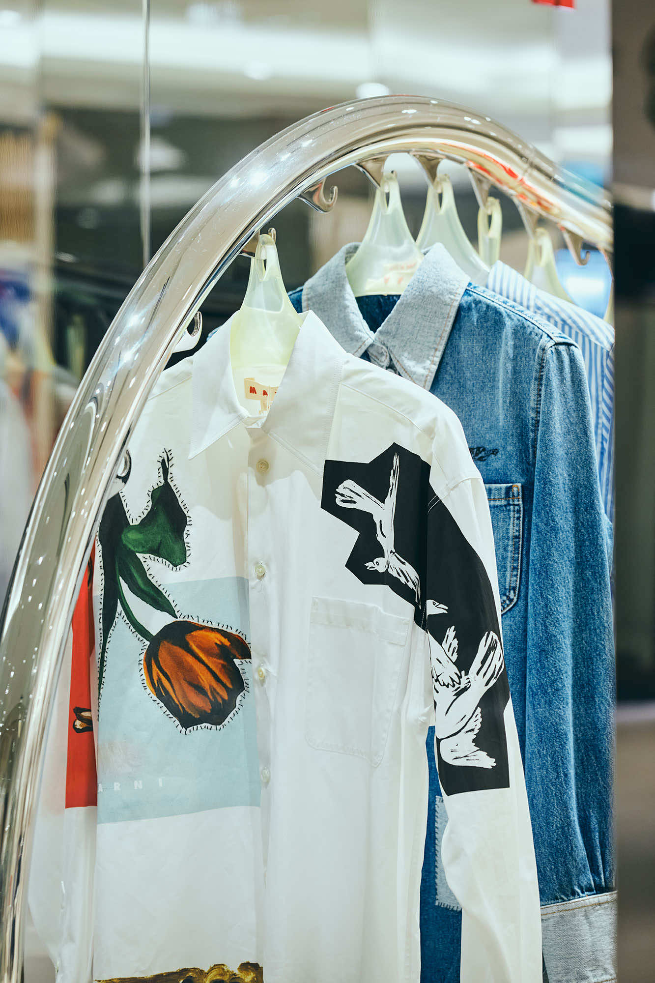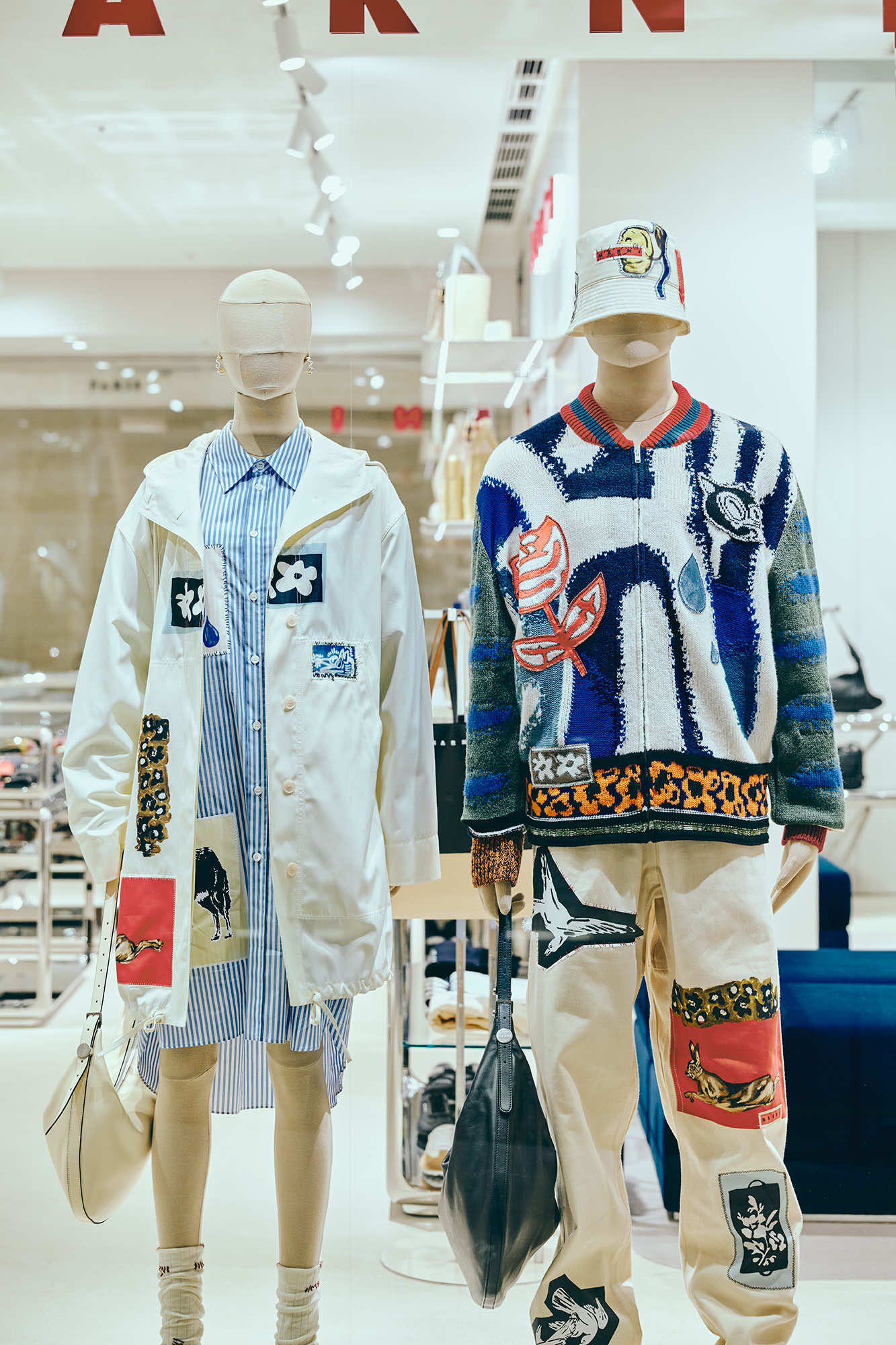 マルニ GINZA SIXでは、そんなストーリーから生まれたウィメンズ、メンズのエフォートレスなワードローブを展開。オオカミ、カラス、涙、チューリップといった象徴的なモチーフが、シャツ、シャツドレス、スカート、ボクサーショーツなど素材に合わせたプリントや技法で施されています。 テンペラ絵具の豊かな質感を忠実に再現した鮮やかな色使いのインターシャニットは、レジデンス期間中のアーティストたちの芸術的な衝動を形にしたデザインです。これらのキールックから引用したカラーやモチーフがバッグなど小物へと落とし込まれています。