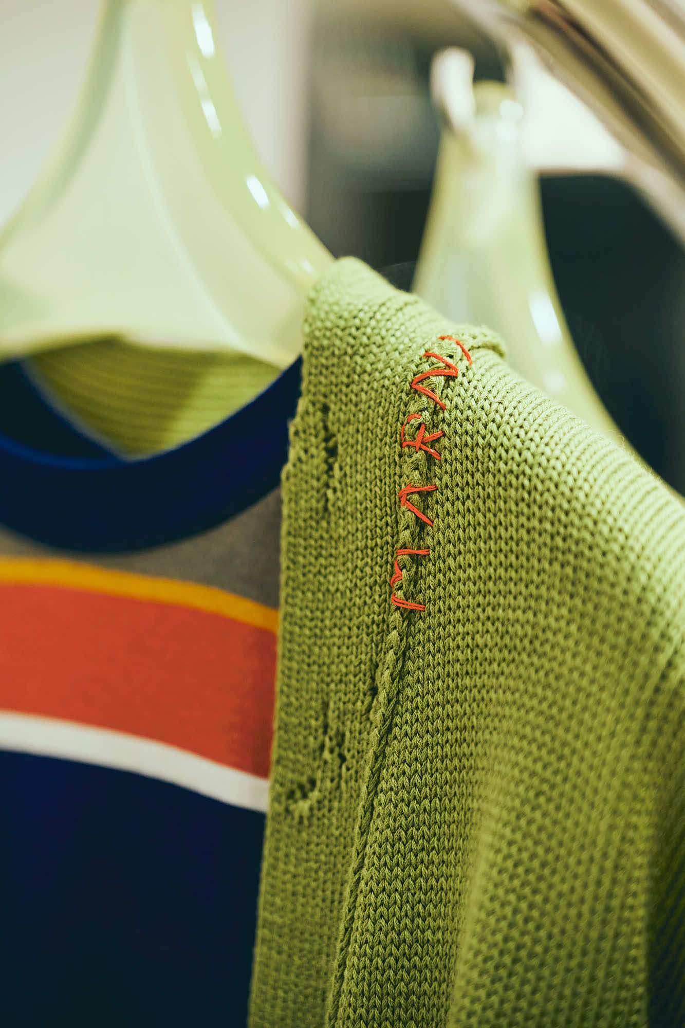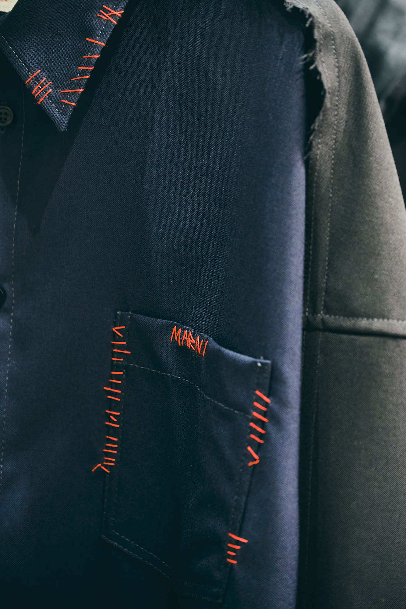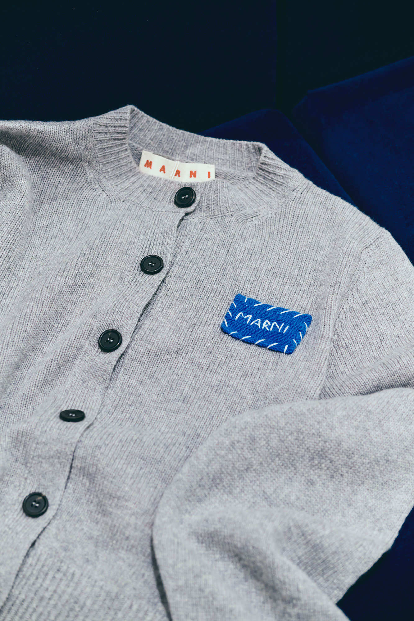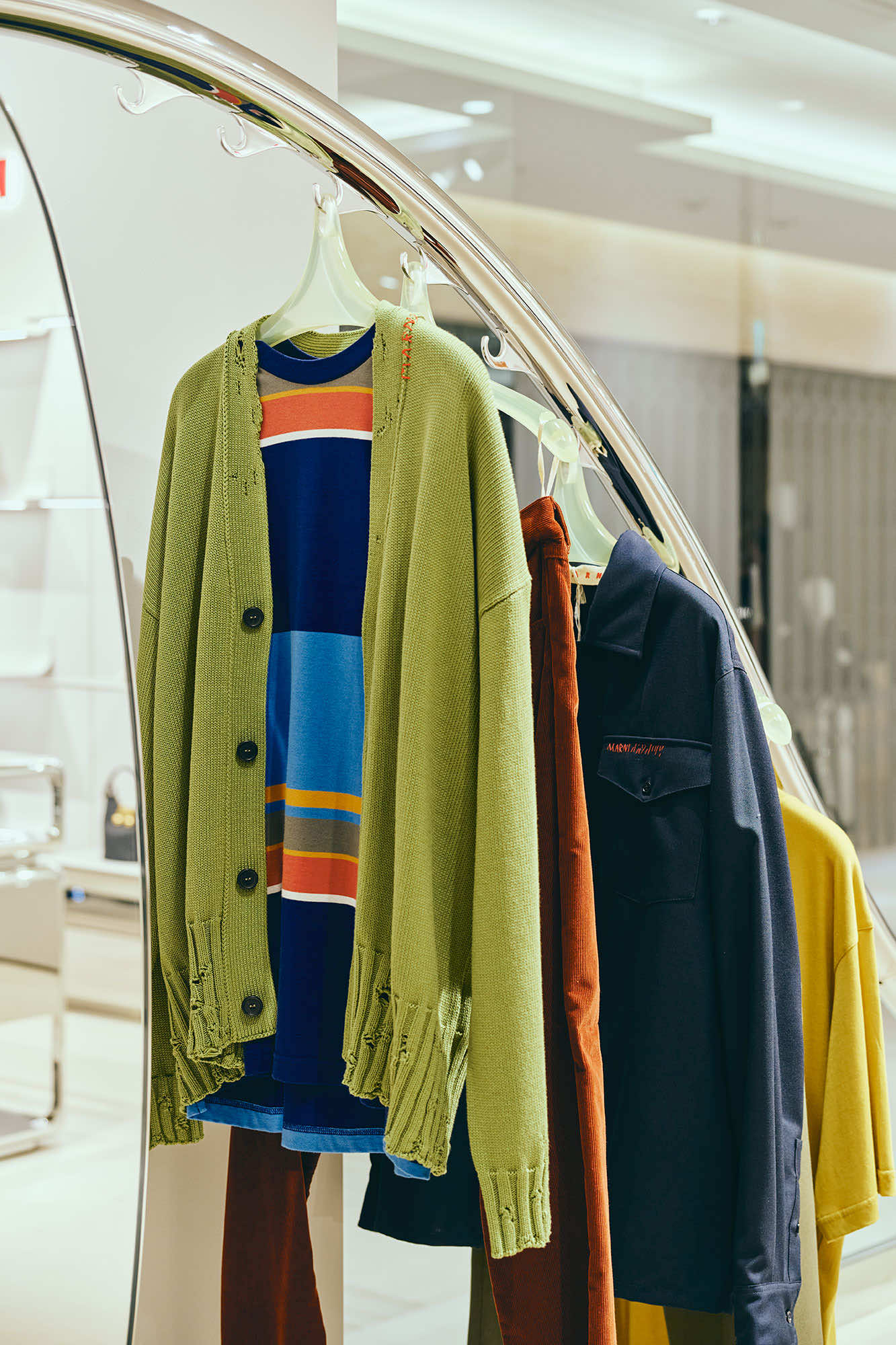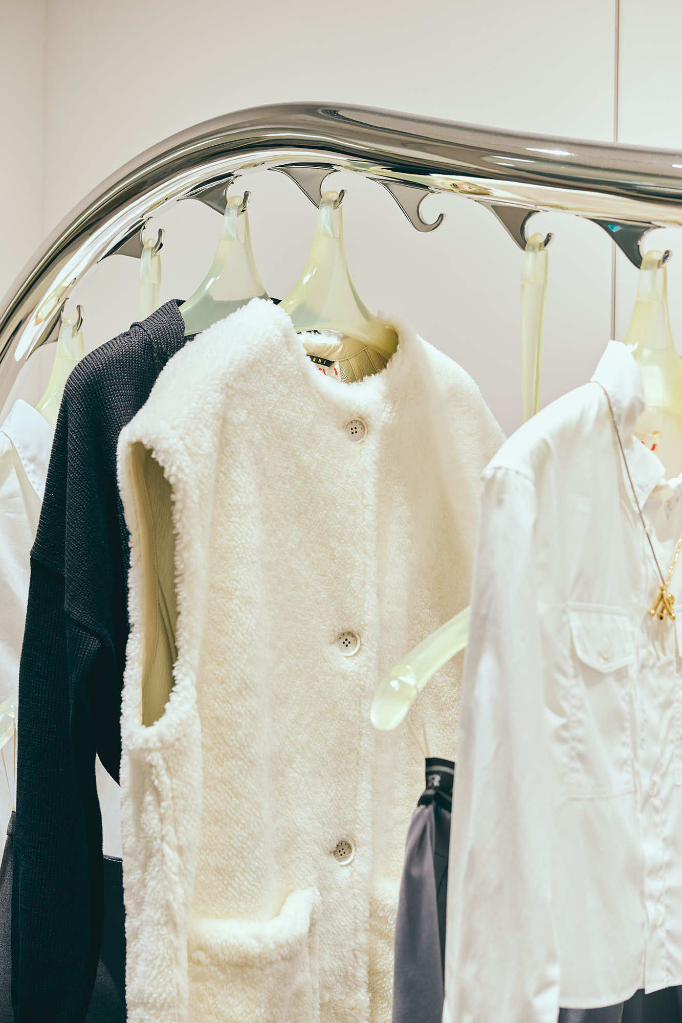 マルニのフィロソフィを色濃く描き出すアーティスティックなコレクションだけでなく、店頭では、マルニらしい素材使いや加工、手仕事にこだわった、エッセンシャルなワードローブも充実しています。カーディガンやベストといったベーシックアイテムには、ハンドステッチ、メンディングのロゴパッチやボタンホールなど、アイコニックなデザインディテールが取り入れられています。シンプルなシアリングノーカラージレは、ふんわりとカットされた柔らかな毛触りと丸みのあるシルエットが印象的。マルニのDNAを反映した上質なクラフツマンシップを感じさせます。