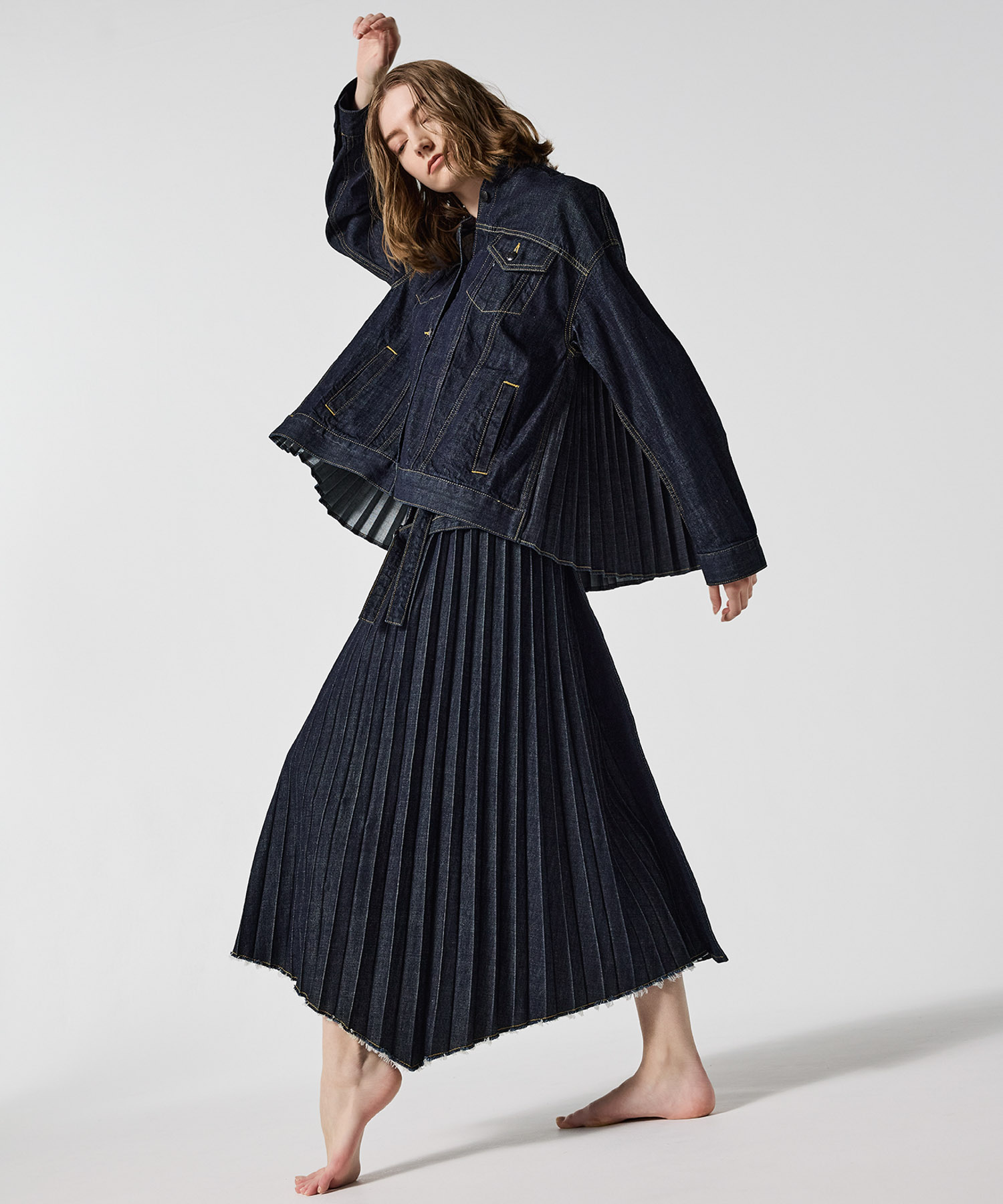 サイドをプリーツにすることでアシンメトリーなシルエットで動くたびに揺れるプリーツが、着こなしに洗練された印象を添えます。デニムにプリーツをかけられるのは日本でもひとつの工場のみ。職人の技術を現代的なデザインに昇華したスカートです。