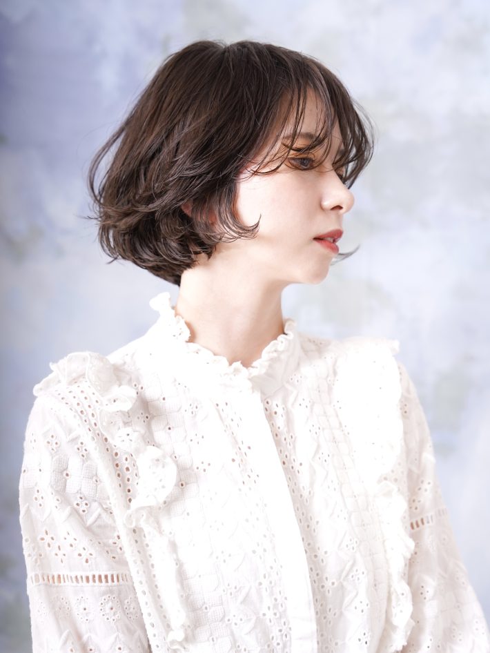 首元が隠れると重く見えがちなボブスタイルをこの秋は襟足ギリギリの長さから前上がりに切ってイメージチェンジ。