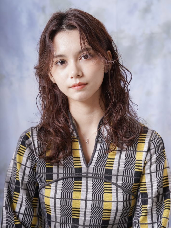 顔まわりにレイヤーの入ったロングスタイル。全体にゆるめのウェーブパーマをかけて自然な動きとボリューム感をプラスすれば抜け感のある柔らかい雰囲気に。