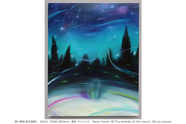 今回の展示では近年取り組んでいるシリーズ《深い森》の新作三点やそれに関連する作品群、また昨年12月に時事通信社より出版された書籍『スペース短歌』の表装画になった作品"Space Pulse"を展示いたします。