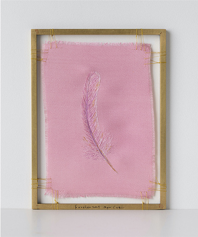 Feather, 2025, 15.6 x 11.6 x 0.5 cm, Silk embroidery on dyed silk cloth, brass