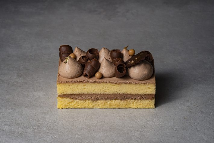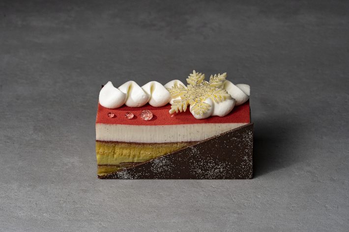 赤い果実のコンフィチュールとピスタチオ生地を何層にも重ね、優しい甘さのホワイトチョコとマスカルポーネムースで華やかに仕上げました。