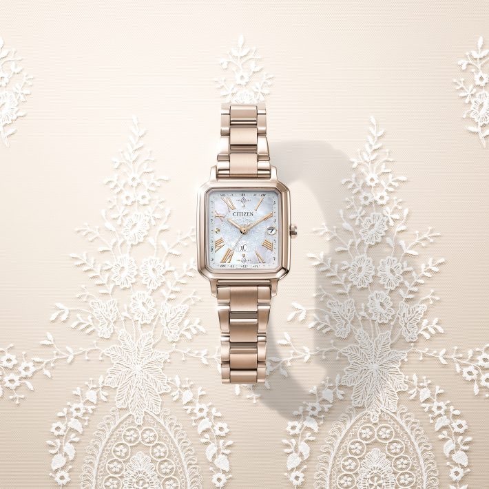 アンティークレースをモチーフにした繊細でやさしい雰囲気の限定モデルです。やさしくフェミニンな印象のサクラピンク色に、クラシカルで華やかな白蝶貝文字板を組み合わせました。その白蝶貝文字盤には、繊細なアンティークレースをモチーフにしたパターンを描き、より洗礼された印象に。