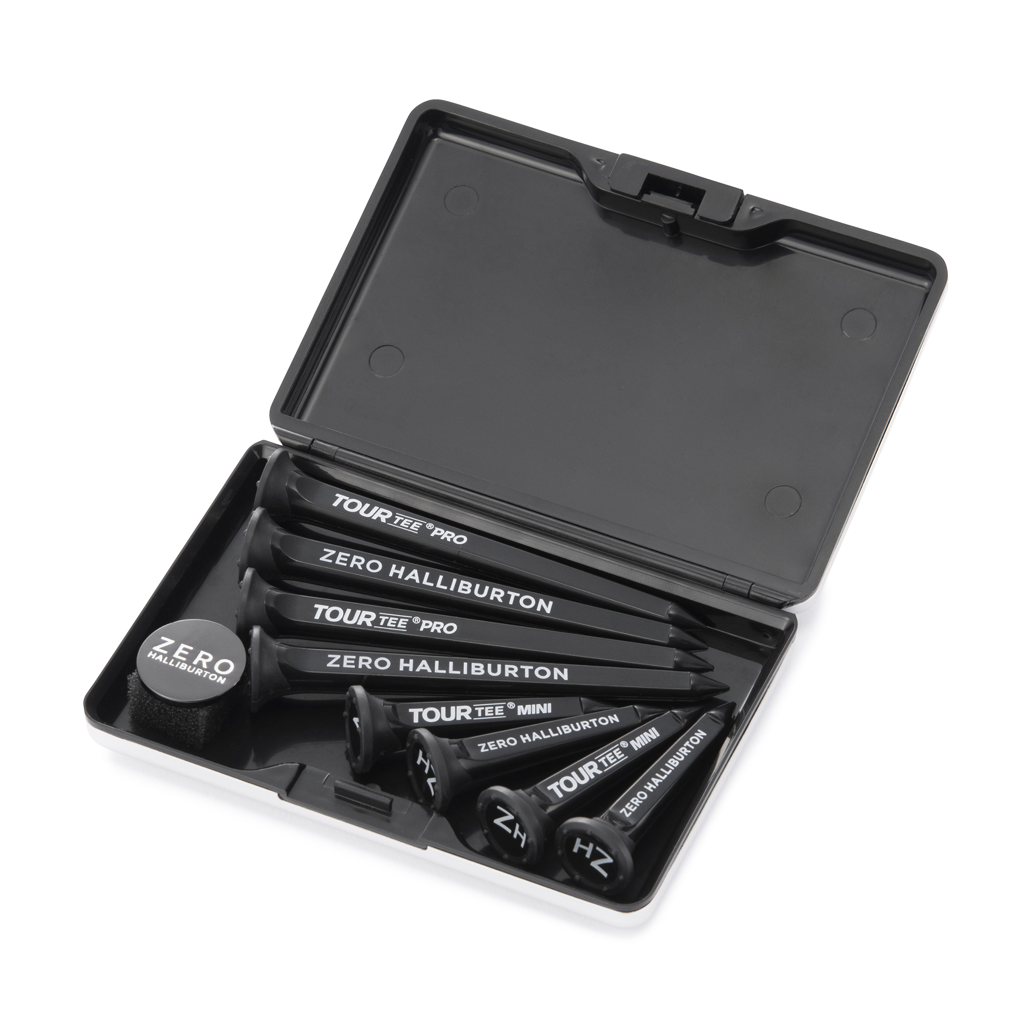 ゼロハリバートンの象徴的なアルミ製アタッシェケースを想起させる、高級感のある専用ケースに、Tour Tee®コラボのブランドロゴ入りロングティー(4本)・ショートティー(4本)と、オリジナルのピン付きボールマーカーを収めたセットです。