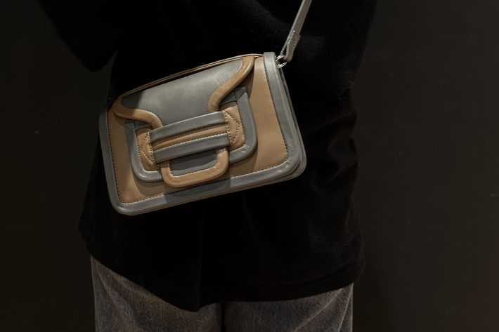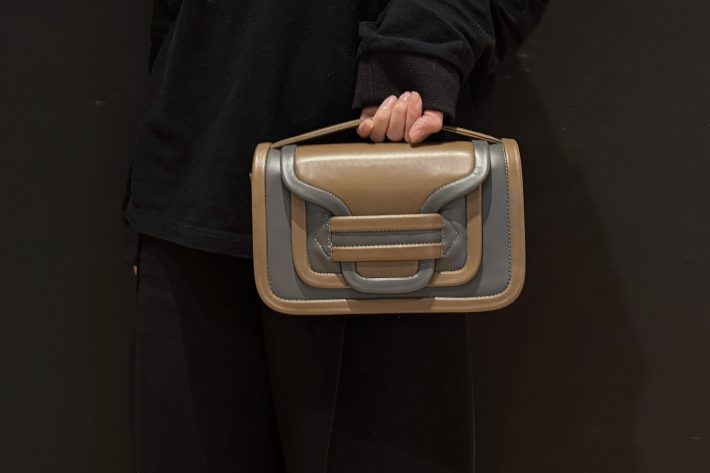 ありそうでなかったグレーとキャメルの組み合わせ。アルファのフォルムに乗せることでモードな印象を放ちます。