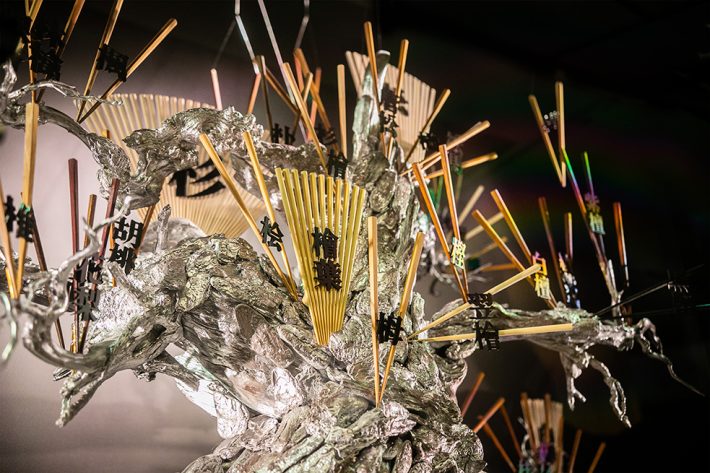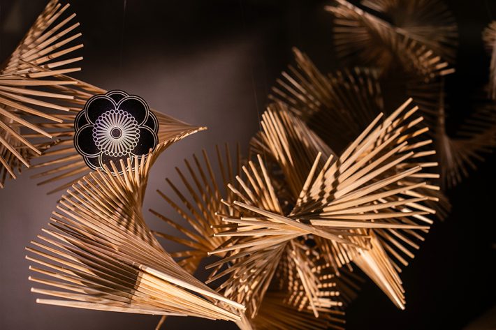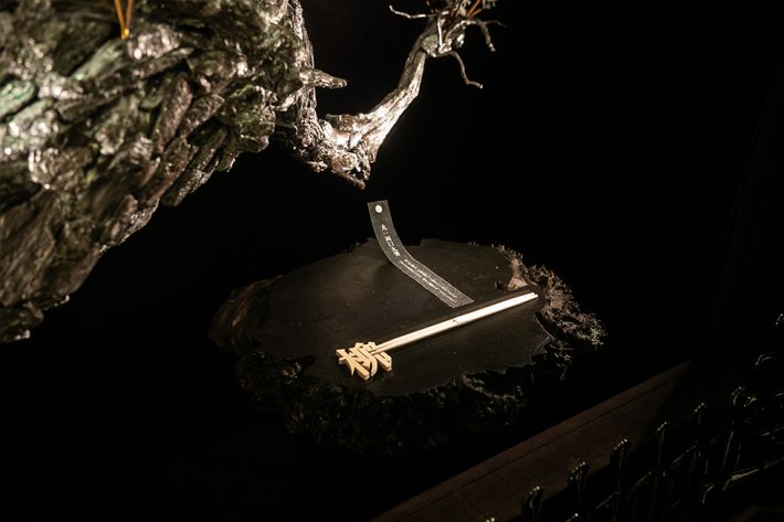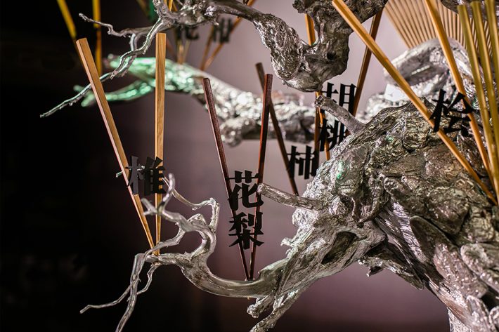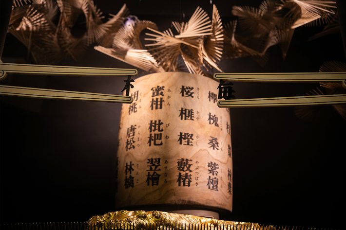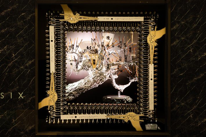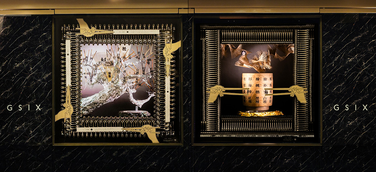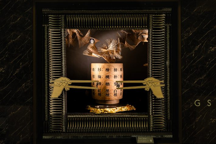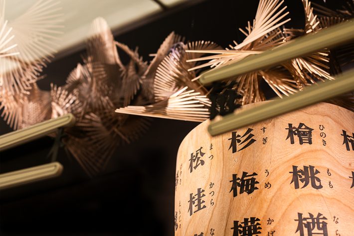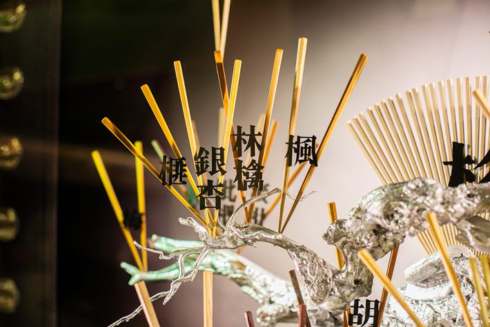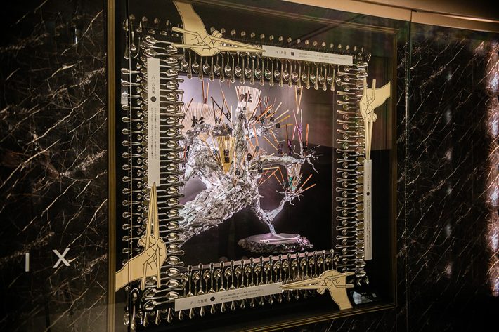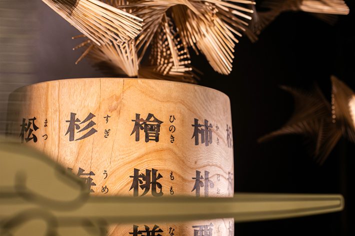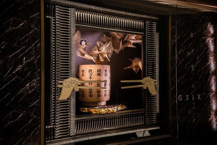 This window expresses the sense of a vibrant, seasonal forest connecting seamlessly with the dining table through objets d’art featuring diverse tree species, styled like bonsai, and a sculpture of chopsticks rising from a large bowl adorned with wood radicals, the basic building blocks of kanji characters. The spiritual essence of precisely arranging a single pair of hashi, combined with the natural presence evoked by the scent of wood, reflects the pleasing aesthetics inherent in Japanese food culture within the space.