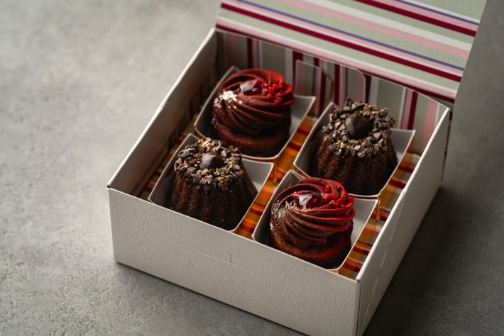 クグロフプティショコラは、中心にペカンナッツを忍ばせた生地に、ビターチョコレートのガナッシュを絞り、ナッツの香ばしさとカカオのほろ苦さが広がる大人の味わいです。