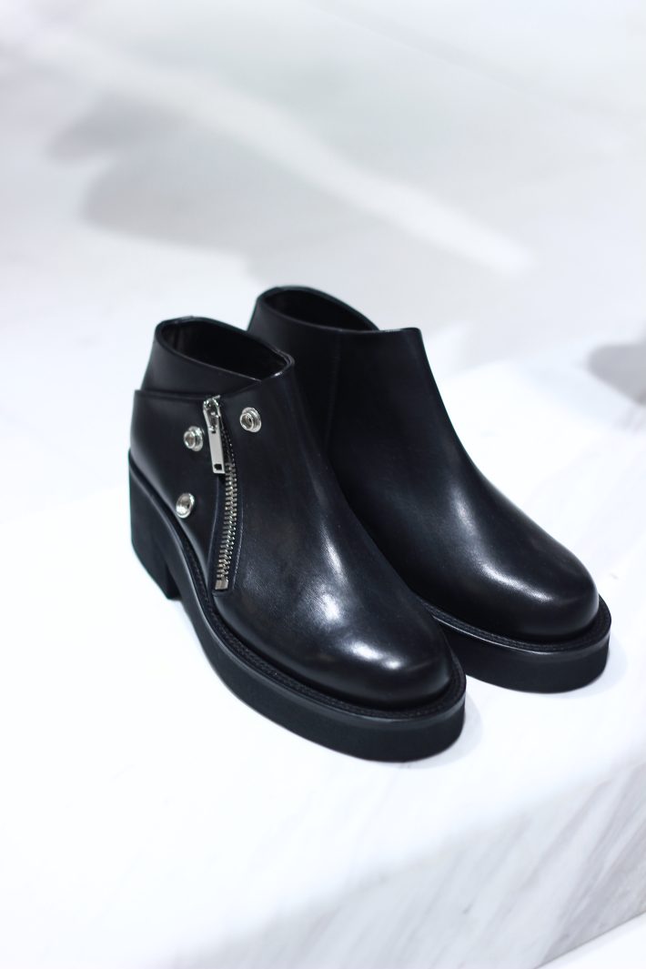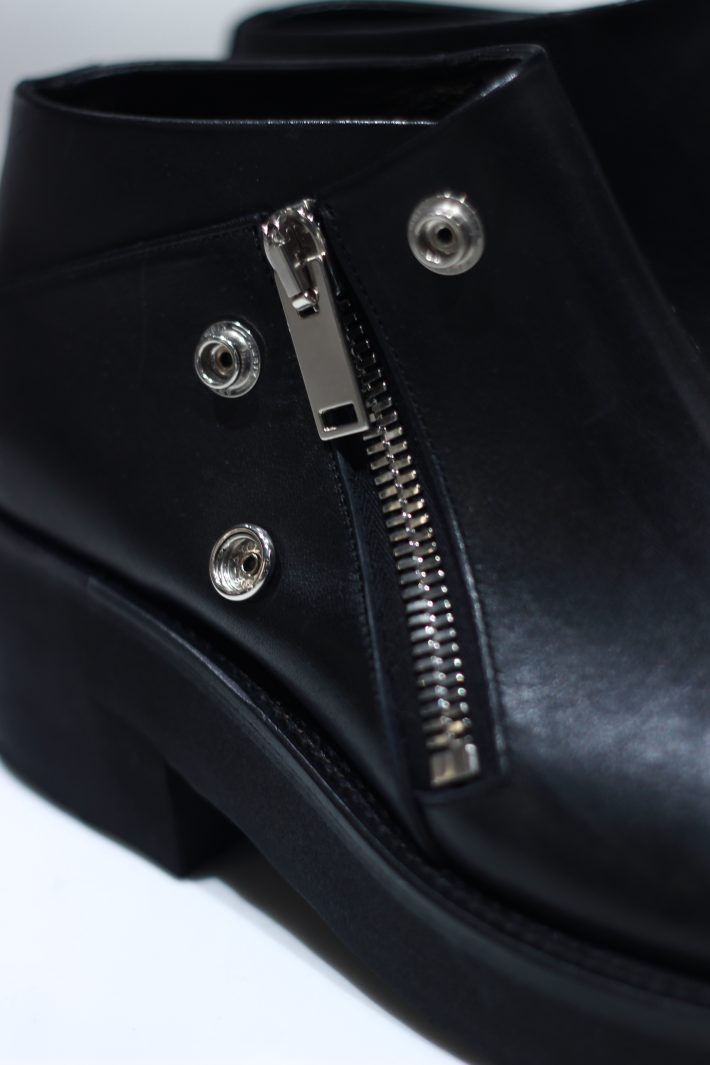 ライダースジャケットをモチーフにした本格派ブーツでサイドジップ×レザーで大人っぽく仕上げられています。モックシルエットで足元の存在感があり、Vibramソール仕様で実用性もあります。ジップアップ中丈ブーツとなっており、幅広いコーデに合うデザインです。