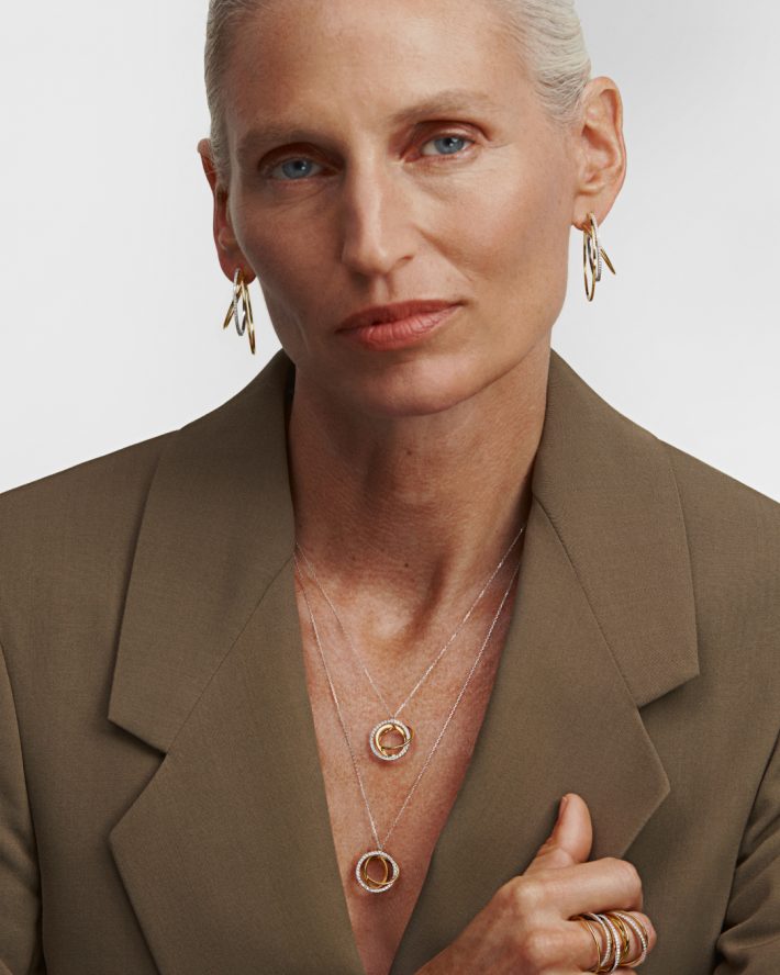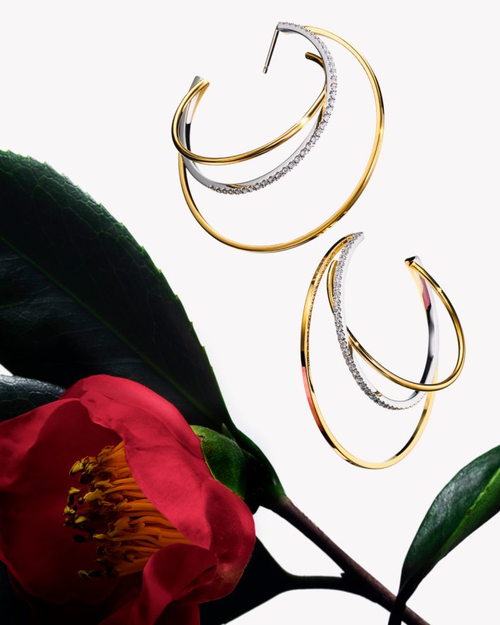 様々なオブジェクトが重なり合うことで生まれる、コンテンポラリーな立体美を描いた「エレメンツ」シリーズに新作が登場いたします。新作“エレメンツ フローティング” は、ダイヤモンドが煌めくプラチナのラインと形状の異なる2本のイエローゴールドのラインが軽やかな浮遊感を宿すモダンなデザイン。視線を移すたびに光の輪郭が新しい表情を描き出します。