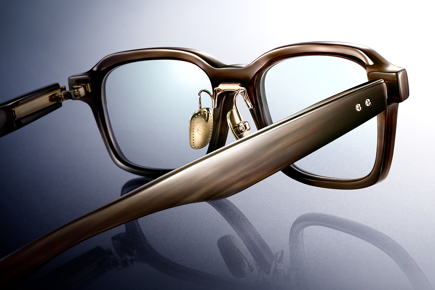 水牛の角が持つ美しい風合いが、フォーナインズの追求してきた快適な掛け心地と調和し、柔らかな掛け味をもたらします。天然素材が醸し出す唯一無二の質感と、メタルの飾りパーツが互いの質感を引き立て合い、上質な表情が宿っています。フォーナインズを象徴する機能パーツ・逆Rヒンジが、頭部を優しく包み込み、ここちよさをいつまでも維持。極上のフレームバランスとバッファローホーンの趣深さが重なり合う、魅力に溢れたシリーズです。