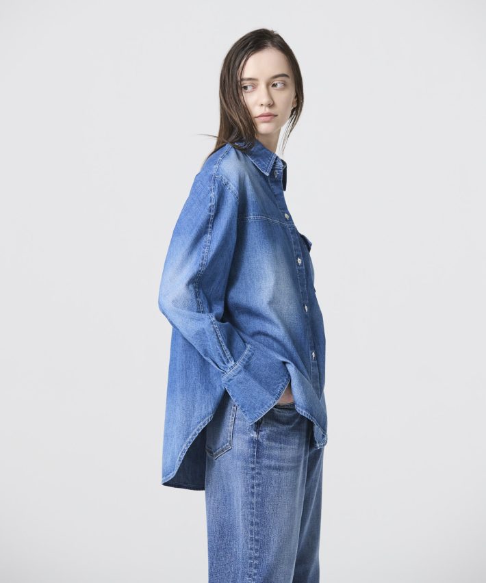 生地はカイハラ染めの7.25オンスデニムを使用。肩回りや胸元、袖に手擦り加工を施し、ヴィンテージ感のある仕上がりに。Tシャツやノースリーブの上に羽織ったり、ニットやジャケットとレイヤードにして、袖口からカフスを覗かせるニュアンスも楽しめます。